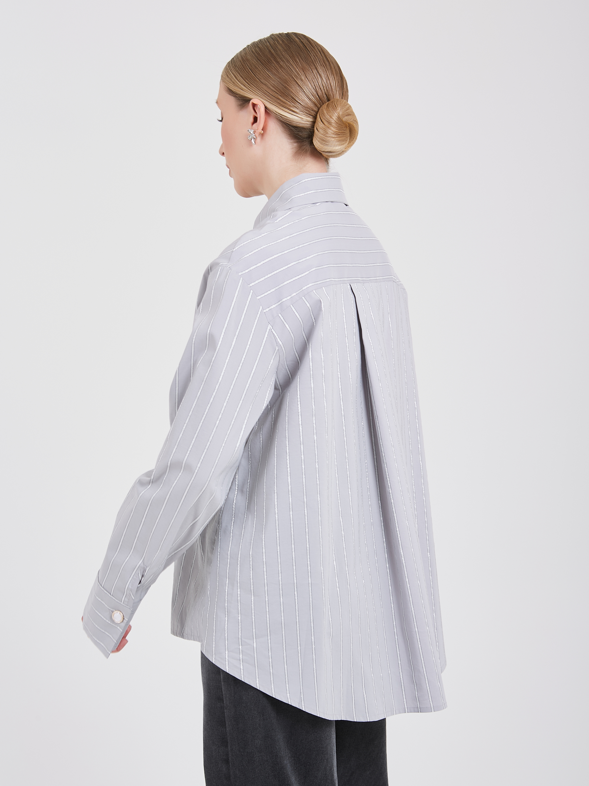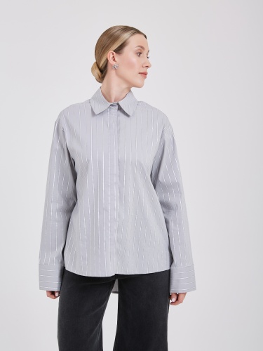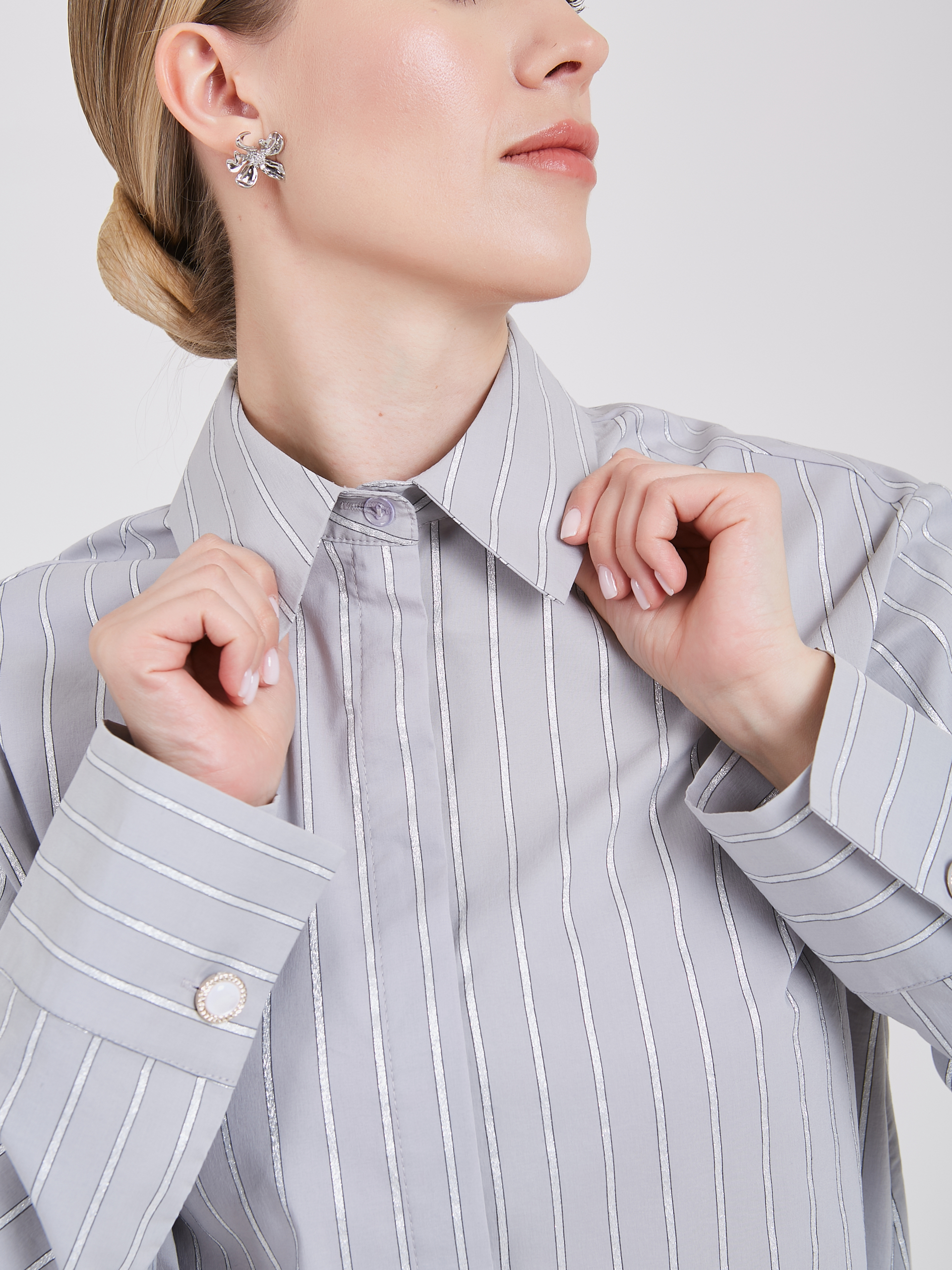 Серая рубашка с классическим воротником и манжетами. Длинные рукава и аккуратные вертикальные полосы делают образ строгим и элегантным.Осень-Зима'25/26. Капсула "Вишневый сад"