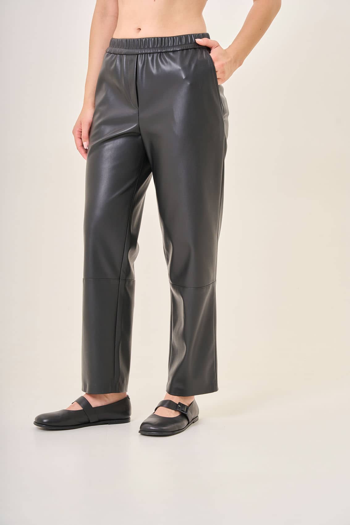 Черные штаны из эко-кожи на средней посадке. Эластичный пояс обеспечивает максимальный комфорт. Центральная строчка спереди создает элегантный акцент на коленях, подчеркивая стройность ног. Тщательно продуманная конструкция идеально садится на любую фигуру, подчеркивает достоинства и придает уверенности. Материал приятен к телу и сохраняет форму даже после многократных стирок. Осень-Зима'25/26. Капсула "Вишневый сад"