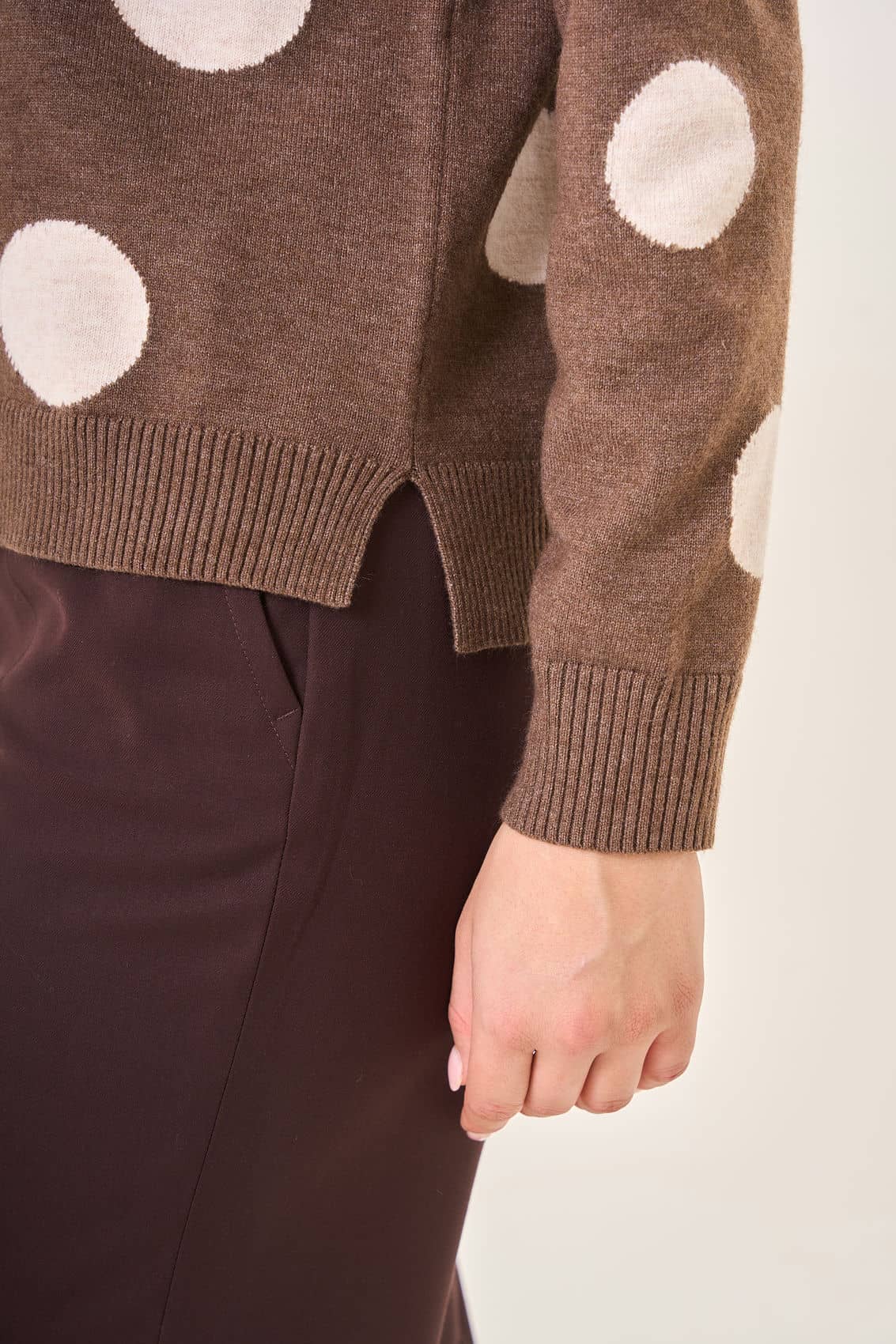 Женский свитер с высоким воротником и свободным кроем. Узоры в виде горошин равномерно распределены по всей поверхности свитера, придавая ему игривость и оригинальность. Материал высокого качества подчеркивает комфорт и удобство в повседневной носке. Осень-Зима'25/26. Капсула "Вино из одуванчиков"