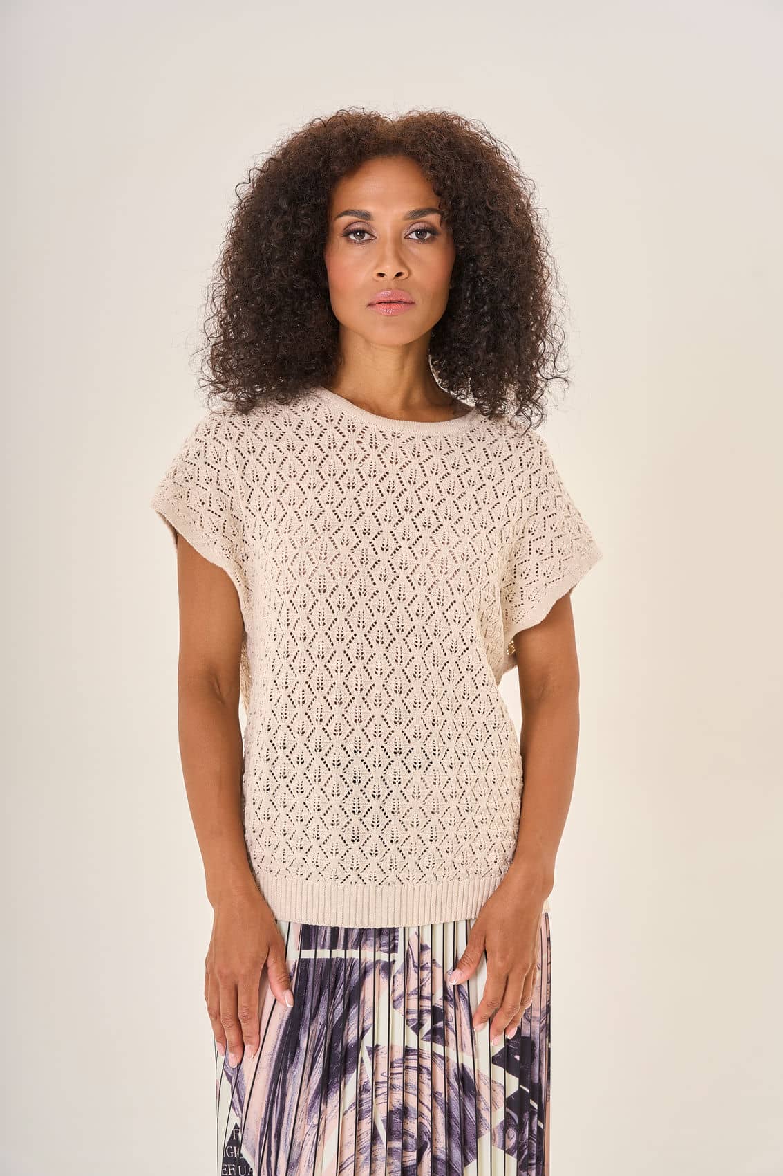 Бежевая вязаная кофта с короткими рукавами. Рельефный узор в виде ромбов добавляет изделию выразительности и уникальности. Мягкий натуральный материал обеспечивает комфорт. Универсальная модель прекрасно дополнит любой наряд, придавая ему уютный и гармоничный вид.