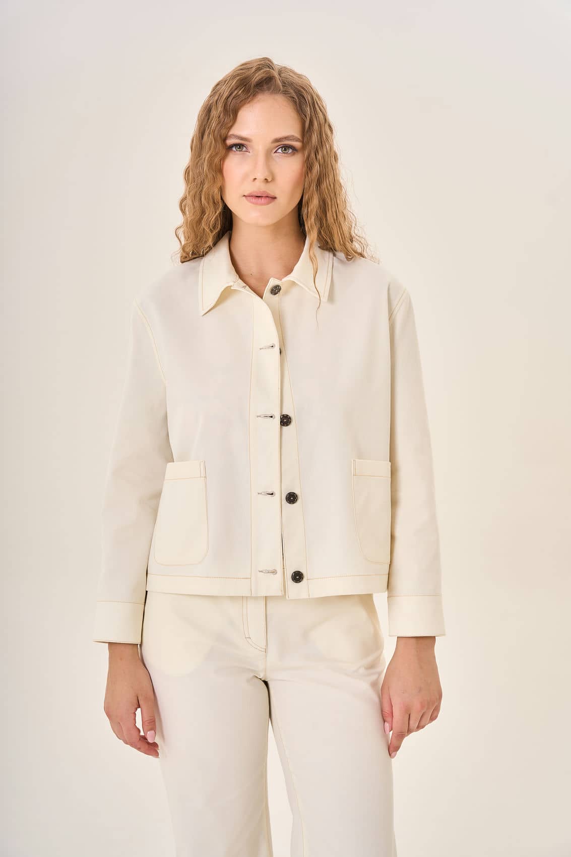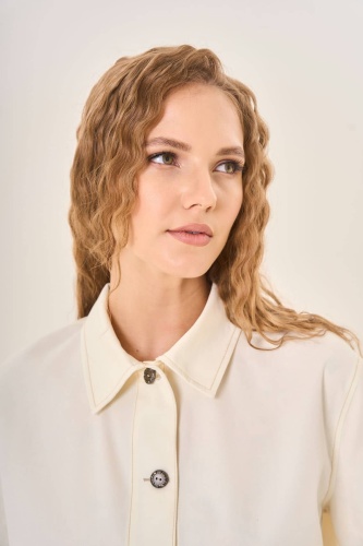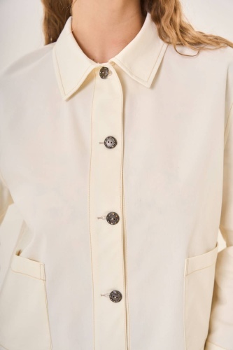 Жакет с классическим отложным воротником и длинными рукавами демонстрирует сдержанный шик. Пяти тёмных пуговиц достаточно, чтобы подчеркнуть строгий силуэт и добавить аккуратности общему виду. Пару накладных карманов впереди удачно завершают композицию, обеспечивая функциональность и дополняя образ лаконичностью деталей. Прочный и качественный материал жакета гарантирует комфорт даже в самую переменчивую погоду.